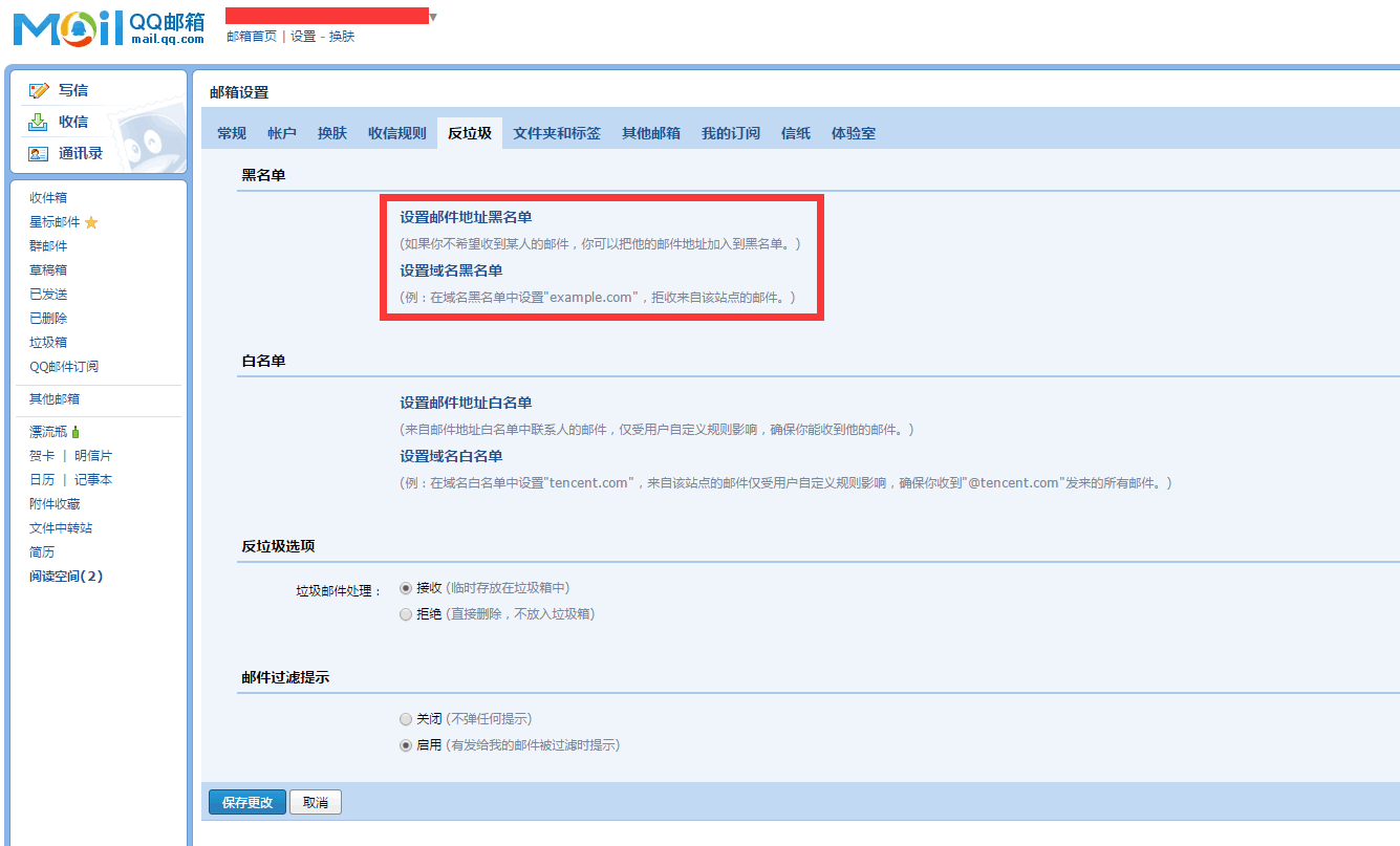 1.进入邮箱"设置"中的"反垃圾"页面,点击"设置域名白名单"